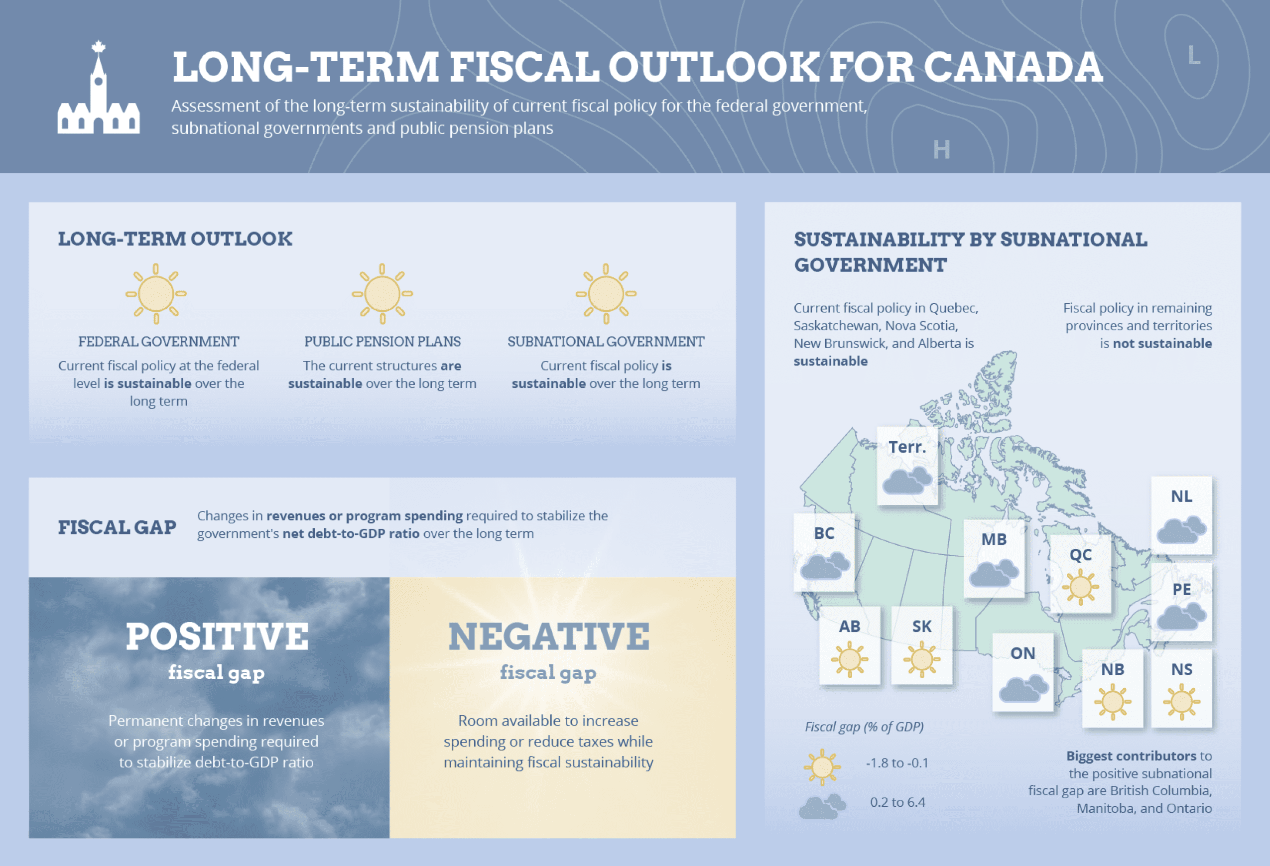 {"id":"RP-2324-011-S","is_published":"2023-07-27T12:57:04.000000Z","release_date":"2023-07-27T13:00:00.000000Z","last_revised_date":null,"title_en":"Fiscal Sustainability Report 2023","title_fr":"Rapport sur la viabilit\u00e9 financi\u00e8re de 2023","internal_id":"RP-2324-011-S","metadata":{"abstract_en":"This report provides PBO\u2019s assessment of the sustainability of government finances over the long term for the federal government, subnational governments and public pension plans.","abstract_fr":"Dans ce rapport, le DPB pr\u00e9sente son \u00e9valuation de la viabilit\u00e9 financi\u00e8re \u00e0 long terme du gouvernement f\u00e9d\u00e9ral, des administrations infranationales et des r\u00e9gimes de retraite g\u00e9n\u00e9raux.","highlights":[{"content":{"en":"From the perspective of the total general government sector, that is federal and subnational governments and public pension plans combined, current fiscal policy in Canada is sustainable over the long term. Relative to the size of the Canadian economy, total general government net debt is projected to decline steadily over the long term due to fiscal room at the federal level and to rising net asset positions in the public pension plans.","fr":"En ce qui concerne le secteur des administrations publiques consid\u00e9r\u00e9es comme un tout, c\u2019est-\u00e0-dire le gouvernement f\u00e9d\u00e9ral, les administrations infranationales et les r\u00e9gimes de retraite g\u00e9n\u00e9raux pris ensemble, la politique budg\u00e9taire actuelle au Canada est viable \u00e0 long terme. Par rapport \u00e0 la taille de l\u2019\u00e9conomie canadienne, la dette publique g\u00e9n\u00e9rale nette devrait diminuer progressivement \u00e0 long terme en raison de la marge de man\u0153uvre financi\u00e8re au niveau f\u00e9d\u00e9ral et de l\u2019am\u00e9lioration de la situation de l\u2019actif net des r\u00e9gimes de retraite publics."}},{"content":{"en":"Current fiscal policy at the federal level is sustainable over the long term. We estimate that the federal government could permanently increase spending or reduce taxes by 1.7 per cent of GDP ($49.5 billion in current dollars, growing in line with GDP thereafter) while maintaining fiscal sustainability.","fr":"La politique budg\u00e9taire f\u00e9d\u00e9rale actuelle est viable \u00e0 long terme. Nous estimons que le gouvernement f\u00e9d\u00e9ral pourrait augmenter ses d\u00e9penses ou r\u00e9duire les imp\u00f4ts de 1,7 % du PIB (49,5 milliards de dollars en dollars courants, augmentant par la suite au rythme du PIB) tout en demeurant viable sur le plan budg\u00e9taire."}},{"content":{"en":"For the subnational government sector, which includes provincial-territorial, local and Indigenous governments, current fiscal policy is sustainable over the long term. Under current policy, projected subnational government revenues and program spending are sufficient to keep the subnational government net debt-to-GDP ratio below its 2022 level over the 75-year projection horizon.","fr":"Pour ce qui est des administrations infranationales, qui comprennent les administrations provinciales, territoriales, locales et autochtones, les politiques budg\u00e9taires actuelles sont viables \u00e0 long terme. Selon la politique actuelle, les revenus et les d\u00e9penses de programmes pr\u00e9vus des administrations infranationales sont suffisantes pour maintenir le ratio de la dette nette par rapport au PIB des administrations infranationales en dessous de son niveau de 2022 pour l\u2019horizon de 75 ans."}},{"content":{"en":"The current structure of the Canada Pension Plan (CPP) and Quebec Pension Plan (QPP) is sustainable over the long term. Under the current structure of the plans, projected contributions and benefits are sufficient to ensure that the net asset-to-GDP position is above its 2022 value after 75 years.","fr":"La structure actuelle tant du R\u00e9gime de pensions du Canada (RPC) que du R\u00e9gime de rentes du Qu\u00e9bec (RRQ) est viable \u00e0 long terme. Avec la structure actuelle des r\u00e9gimes, les cotisations et les prestations pr\u00e9vues sont suffisantes pour garantir que la position nette de l\u2019actif par rapport au PIB est sup\u00e9rieure \u00e0 sa valeur de 2022 apr\u00e8s 75 ans."}}]},"updated_at":"2023-09-19T18:08:03.000000Z","type":"RP","slug":"RP-2324-011-S--fiscal-sustainability-report-2023--rapport-viabilite-financiere-2023","permalinks":{"en":{"website":"https:\/\/www.pbo-dpb.ca\/en\/publications\/RP-2324-011-S--fiscal-sustainability-report-2023--rapport-viabilite-financiere-2023","preview":"https:\/\/www.pbo-dpb.ca\/en\/publications\/RP-2324-011-S--fiscal-sustainability-report-2023--rapport-viabilite-financiere-2023"},"fr":{"website":"https:\/\/www.pbo-dpb.ca\/fr\/publications\/RP-2324-011-S--fiscal-sustainability-report-2023--rapport-viabilite-financiere-2023","preview":"https:\/\/www.pbo-dpb.ca\/fr\/publications\/RP-2324-011-S--fiscal-sustainability-report-2023--rapport-viabilite-financiere-2023"}},"artifacts":{"main":{"en":{"public":"https:\/\/distribution-a617274656661637473.pbo-dpb.ca\/14112865d6961441f766fa6e8f511a29368a6a15a3e8b8445af18c7cbda6d632"},"fr":{"public":"https:\/\/distribution-a617274656661637473.pbo-dpb.ca\/141f168b00bd920bc9c6e23fa8192e335ec315ad6ab81a1311d298867ae44a28"}}},"coverpages":{"distribution":{"fr":{"small":"https:\/\/distribution-i696d61676573.pbo-dpb.ca\/f5a6d162ca59b837a46677d33f93a808d448d23ce2f3d0f728a1b7615ca4c325","large":"https:\/\/distribution-i696d61676573.pbo-dpb.ca\/b64905908e3cdb87a564f5d894fbe47a75d3c8b016f20e0591566ef8df799621","h150_png_optimized":"https:\/\/distribution-i696d61676573.pbo-dpb.ca\/d13ebfbc0b98705694fd02a04eff3b3ee7a5d8e9f49d050ff4cea132bdbed972","h150_webp":"https:\/\/distribution-i696d61676573.pbo-dpb.ca\/06f22380d687d415721a031d2205907078627a6c93819aabb91ddb4ea46c7345","h300_png_optimized":"https:\/\/distribution-i696d61676573.pbo-dpb.ca\/3e543c446205fe491ea1a7a5f1597394f9c988b6ade37e61c5cf965b3aa39b6a","h300_webp