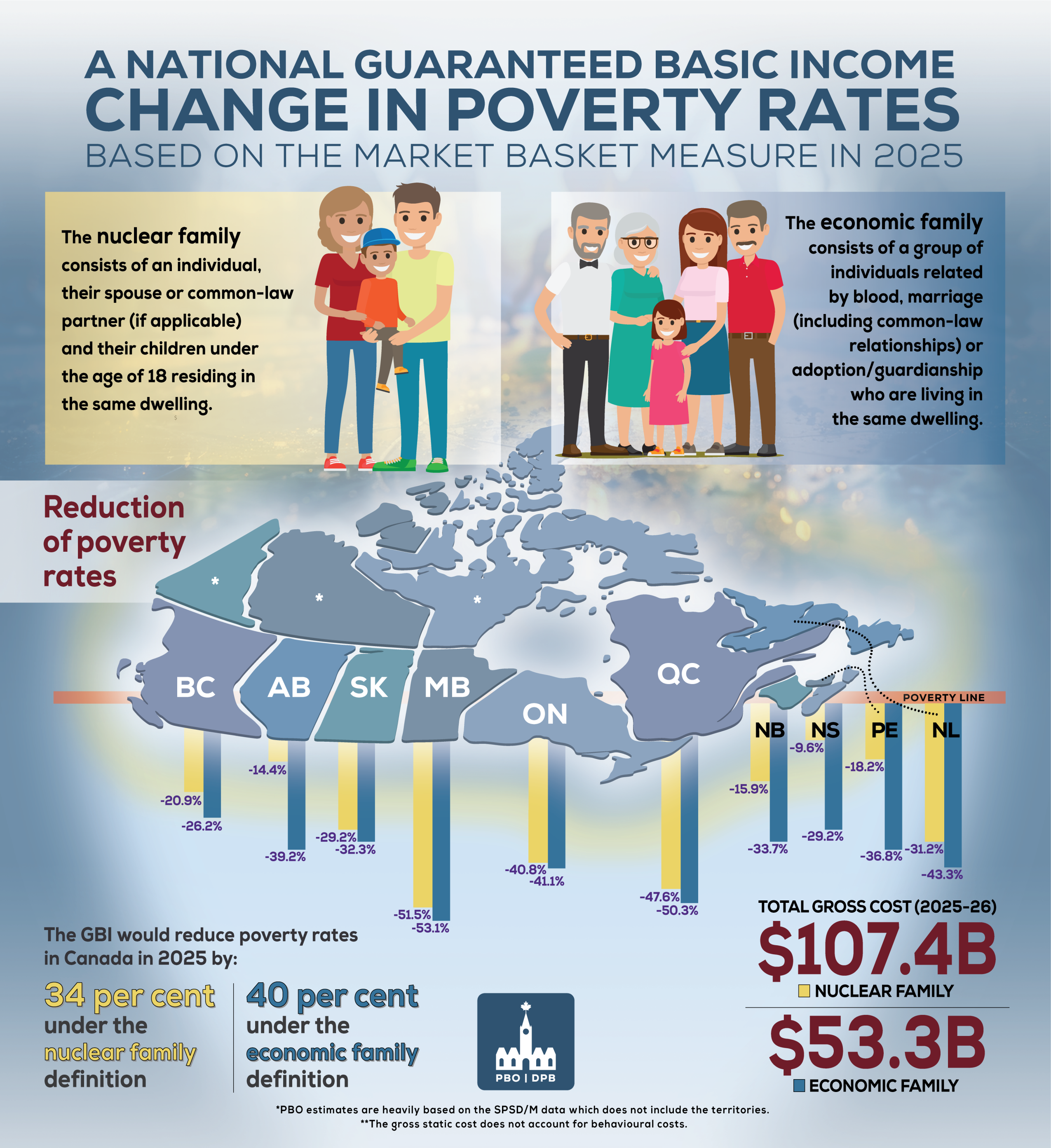 {"id":"RP-2425-029-S","is_published":"2025-02-19T13:57:08.000000Z","release_date":"2025-02-19T14:00:00.000000Z","last_revised_date":null,"title_en":"A Distributional Analysis of a National Guaranteed Basic Income \u2013 Update","title_fr":"Analyse distributive d\u2019un revenu de base garanti \u00e0 l\u2019\u00e9chelle nationale \u2013 Mise \u00e0 jour","internal_id":"RP-2425-029-S","metadata":{"abstract_en":"This report provides an update of PBO\u2019s distributional analysis of a Guaranteed Basic Income.","abstract_fr":"Ce rapport pr\u00e9sente une mise \u00e0 jour de l\u0027analyse distributive d\u2019un revenu de base garanti r\u00e9alis\u00e9e par le DPB.","highlights":[{"content":{"en":"In this update, the Parliamentary Budget Officer (PBO) provides fiscal and distributional impacts of the GBI using two different definitions of the family unit, that is the nuclear family and the economic family.","fr":"Dans cette mise \u00e0 jour, le directeur parlementaire du budget (DPB) pr\u00e9sente les incidences fiscales et distributives d\u2019un revenu de base garanti (RBG) selon deux d\u00e9finitions diff\u00e9rentes de l\u0027unit\u00e9 familiale, \u00e0 savoir la famille nucl\u00e9aire et la famille \u00e9conomique."}},{"content":{"en":"The gross cost of the GBI, excluding behavioural costs, is estimated at $107 billion in 2025 under the nuclear family unit definition. The same cost measure is roughly cut in half to $53 billion when using the broader economic family unit.","fr":"Le co\u00fbt brut du RBG, excluant les co\u00fbts comportementaux, est \u00e9valu\u00e9 \u00e0 107 milliards de dollars en 2025 avec la d\u00e9finition de la famille nucl\u00e9aire. Ce m\u00eame co\u00fbt est pratiquement r\u00e9duit de moiti\u00e9 et se chiffre \u00e0 53 milliards de dollars si l\u0027on utilise la d\u00e9finition plus large de la famille \u00e9conomique."}},{"content":{"en":"The GBI affects household disposable income progressively for both family types. The largest benefit is observed in the lowest income quintile, while higher income quintiles experience a loss in disposable income due to adjustments to the tax system and relatively lower GBI transfers.","fr":"Le RBG a une incidence progressive sur le revenu disponible des m\u00e9nages pour les deux types de famille. Le gain le plus important est observ\u00e9 dans le quintile de revenu le plus bas, tandis que les quintiles de revenu plus \u00e9lev\u00e9s subissent une perte de revenu disponible en raison des ajustements apport\u00e9s au r\u00e9gime fiscal et des transferts relativement plus bas du RBG."}},{"content":{"en":"At the national level, GBI would reduce poverty rates, as measured by the Market Basket Measure (MBM), by 34% for the nuclear family definition and 40% for the economic family definition in 2025.","fr":"Les taux de pauvret\u00e9 \u00e0 l\u2019\u00e9chelle nationale sont \u00e9tablis par la mesure du panier de consommation (MPC); en 2025, le RBG les r\u00e9duirait de 34 % pour la d\u00e9finition de la famille nucl\u00e9aire, et de 40 % pour celle de la famille \u00e9conomique."}},{"content":{"en":"The behavioural cost of GBI under the nuclear family definition would amount to $5 billion, compared to $3.6 billion under the economic family definition.","fr":"Le co\u00fbt comportemental du RBG s\u0027\u00e9l\u00e8verait \u00e0 5 milliards de dollars selon la d\u00e9finition de la famille nucl\u00e9aire, contre 3,6 milliards de dollars selon celle de la famille \u00e9conomique."}}]},"updated_at":"2025-02-19T13:57:08.000000Z","type":"RP","slug":"RP-2425-029-S--distributional-analysis-national-guaranteed-basic-income-update--analyse-distributive-un-revenu-base-garanti-echelle-nationale-mise-jour","permalinks":{"en":{"website":"https:\/\/www.pbo-dpb.ca\/en\/publications\/RP-2425-029-S--distributional-analysis-national-guaranteed-basic-income-update--analyse-distributive-un-revenu-base-garanti-echelle-nationale-mise-jour","preview":"https:\/\/www.pbo-dpb.ca\/en\/publications\/RP-2425-029-S--distributional-analysis-national-guaranteed-basic-income-update--analyse-distributive-un-revenu-base-garanti-echelle-nationale-mise-jour"},"fr":{"website":"https:\/\/www.pbo-dpb.ca\/fr\/publications\/RP-2425-029-S--distributional-analysis-national-guaranteed-basic-income-update--analyse-distributive-un-revenu-base-garanti-echelle-nationale-mise-jour","preview":"https:\/\/www.pbo-dpb.ca\/fr\/publications\/RP-2425-029-S--distributional-analysis-national-guaranteed-basic-income-update--analyse-distributive-un-revenu-base-garanti-echelle-nationale-mise-jour"}},"artifacts":{"main":{"en":{"public":"https:\/\/distribution-a617274656661637473.pbo-dpb.ca\/827eba1e752214dc65904faca913d39e87f64c57fc186ce4bf8b8936cd851cc0"},"fr":{"public":"https:\/\/distribution-a617274656661637473.pbo-dpb.ca\/3bb62b52cca990d739574f08b9f258ff828306eedfe07a8f3891f8ac8a040623"}}},"coverpages":{"distribution":{"fr":{"small":"https:\/\/distribution-i696d61676573.pbo-dpb.ca\/6e37b7633e6f1557ac61c06c8a0318d1e12b62a1f73ab1eeb3a05ba2eb56a427","large":"https:\/\/distribution-i696d61676573.pbo-dpb.ca\/702c087cfad6d32dd45b13b1b967c8bda4515f86166542d4a167a4b111bc54b4","h150_png_optimized":"https:\/\/distribution-i696d61676573.pbo-dpb.ca\/e8afeaef8c72575009445bea97ca92f230459cdffa535e8e0a722717a9c5ae85","h150_webp":"https:\/\/distribution-i696d61676573.pbo-dpb.ca\/f15e85acea263c5c78fe13bb4246cb760efaade3c86de0b04b9170edff29e7eb","h300_png_optimized":"https:\/\/distribution-i696d61676573.pbo-dpb.ca\/c1659ef51eb144e52331bafbd27b768ef56d3004f763e157409b3649c0e7e3e3","h300_webp":"https:\/\/distribution-i696d61676573.pbo-dpb.ca\/b004d394b2160190e2f2466efc817ae9f0593173e9a1919d08089b1fd0a858e0","h600_png_optimized":"https:\/\/distribution-i696d61676573.pbo-dpb.ca\/a13108ecda840a80e706177bb154dfbd2a1e6b5151902ba3d5d315940a209989","h600_webp":"https:\/\/distribution-i696d61676573.pbo-dpb.ca\/17b0c1b9f920c5aadf13676e65fb3a64205438494d5a56a83a40ed3d8f378cbb"},"en":{"small":"https:\/\/distribution-