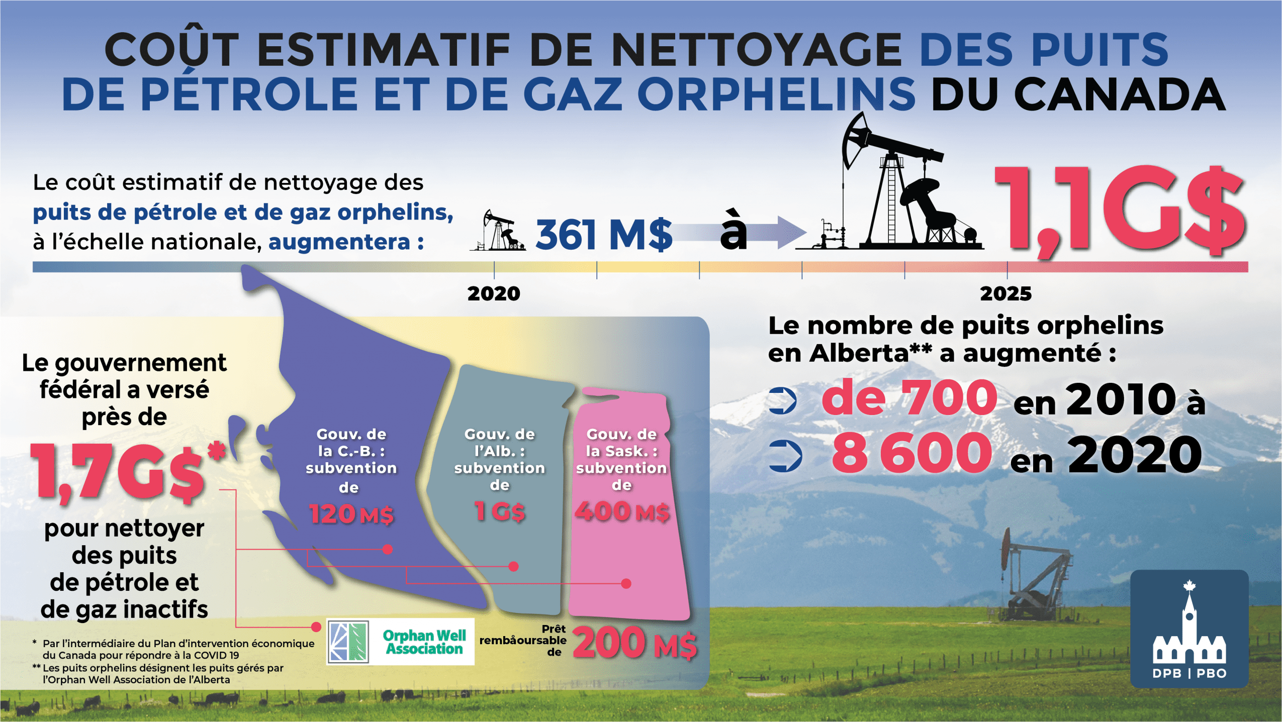{"id":"RP-2122-026-S","is_published":"2022-01-25T14:00:09.000000Z","release_date":"2022-01-25T14:00:00.000000Z","last_revised_date":null,"title_en":"Estimated Cost of Cleaning Canada\u2019s Orphan Oil and Gas Wells","title_fr":"Co\u00fbt estimatif du nettoyage des puits de p\u00e9trole et de gaz orphelins du Canada","internal_id":"RP-2122-026-S","metadata":{"abstract_en":"This report provides an independent estimate of the cost of cleaning Canada\u2019s orphan oil and gas wells.","abstract_fr":"Le pr\u00e9sent rapport fournit une estimation ind\u00e9pendante du co\u00fbt du nettoyage des puits de p\u00e9trole et de gaz orphelins du Canada.","highlights":[{"content":{"en":"As of 2020, roughly 36 per cent of all wells in Alberta and Saskatchewan are active, the lowest share in recorded history. Inactive and plugged wells make up roughly 37 per cent of all wells.","fr":"En 2020, environ 36 % de tous les puits de l\u2019Alberta et de la Saskatchewan \u00e9taient actifs, soit le taux le plus faible jamais enregistr\u00e9. Les puits inactifs et colmat\u00e9s repr\u00e9sentent environ 37 % de tous les puits."}},{"content":{"en":"Provincial regulators require oil and natural gas companies to close inactive well sites. In the case where there is no known, financially viable operator capable of addressing the environmental liabilities associated with closing their wells, the wells under the company are deemed orphaned.","fr":"Les organismes de r\u00e9glementation provinciaux exigent que les entreprises p\u00e9troli\u00e8res et gazi\u00e8res ferment les puits inactifs. Les puits d\u2019une entreprise sont consid\u00e9r\u00e9s comme orphelins dans le cas o\u00f9 il n\u2019y a pas d\u2019exploitant connu et financi\u00e8rement viable qui soit capable de s\u2019acquitter des responsabilit\u00e9s environnementales associ\u00e9es \u00e0 la fermeture de ceux-ci."}},{"content":{"en":"In Alberta, the number of orphaned wells has increased from 700 to more than 8,600 over the last 10 years.","fr":"En Alberta, le nombre de puits orphelins est pass\u00e9 de 700 \u00e0 plus de 8 600 au cours des dix derni\u00e8res ann\u00e9es."}},{"content":{"en":"PBO estimates the cumulative cost for orphan well clean-up, on a national level, to be $361 million as of 2020.","fr":"Le DPB estime le co\u00fbt cumulatif du nettoyage des puits orphelins \u00e0 361 millions de dollars, \u00e0 l\u2019\u00e9chelle nationale, en 2020."}},{"content":{"en":"PBO estimates the cost of orphan well clean-up in Canada to reach $1.1 billion by 2025.","fr":"Le DPB estime que le co\u00fbt du nettoyage des puits orphelins au Canada atteindra 1,1 milliard de dollars d\u2019ici 2025."}},{"content":{"en":"At face value, the $1.7 billion allocated by the federal government through the Covid-19 Economic Response should be sufficient to cover the estimated clean-up of inactive oil and gas wells in the medium term. However, current provincial allocations give rise to an outstanding risk in the medium-term that the projected liability could persist if funding continues to be allocated to firms that do not have acute financial risk.","fr":"\u00c0 premi\u00e8re vue, la somme de 1,7 milliard de dollars allou\u00e9e dans le cadre du Plan d\u2019intervention \u00e9conomique du Canada pour r\u00e9pondre \u00e0 la COVID-19 devrait \u00eatre suffisante pour couvrir le co\u00fbt estimatif du nettoyage des puits de p\u00e9trole et de gaz inactifs \u00e0 moyen terme. Toutefois, il existe un risque \u00e0 moyen terme que les passifs projet\u00e9s persistent si les provinces continuent d\u2019attribuer des fonds aux entreprises qui n\u2019ont pas de risque financier \u00e9lev\u00e9."}}]},"updated_at":"2022-01-25T19:19:59.000000Z","type":"RP","slug":"RP-2122-026-S--estimated-cost-cleaning-canada-orphan-oil-gas-wells--cout-estimatif-nettoyage-puits-petrole-gaz-orphelins-canada","permalinks":{"en":{"website":"https:\/\/www.pbo-dpb.ca\/en\/publications\/RP-2122-026-S--estimated-cost-cleaning-canada-orphan-oil-gas-wells--cout-estimatif-nettoyage-puits-petrole-gaz-orphelins-canada","preview":"https:\/\/www.pbo-dpb.ca\/en\/publications\/RP-2122-026-S--estimated-cost-cleaning-canada-orphan-oil-gas-wells--cout-estimatif-nettoyage-puits-petrole-gaz-orphelins-canada"},"fr":{"website":"https:\/\/www.pbo-dpb.ca\/fr\/publications\/RP-2122-026-S--estimated-cost-cleaning-canada-orphan-oil-gas-wells--cout-estimatif-nettoyage-puits-petrole-gaz-orphelins-canada","preview":"https:\/\/www.pbo-dpb.ca\/fr\/publications\/RP-2122-026-S--estimated-cost-cleaning-canada-orphan-oil-gas-wells--cout-estimatif-nettoyage-puits-petrole-gaz-orphelins-canada"}},"artifacts":{"main":{"en":{"public":"https:\/\/distribution-a617274656661637473.pbo-dpb.ca\/44de649e994977a9771ff83959ba6b9563f5c1352ec3ba4f83c4d256f40a6b41"},"fr":{"public":"https:\/\/distribution-a617274656661637473.pbo-dpb.ca\/f585eece167a9e98232eb8d15328ed76e09bb696570696c30c74563b12fdf372"}}},"coverpages":{"distribution":{"fr":{"small":"https:\/\/distribution-i696d61676573.pbo-dpb.ca\/d4e0ecf34f5d12d1b64dd5f4d9605becb8acc3fc302f78daa20f5d23986b3e45","large":"https:\/\/distribution-i696d61676573.pbo-dpb.ca\/298c53fb22cbe648e4e37495fc1b21c69380d10f3970664424ec3c9f49458570","h150_png_optimized":"https:\/\/distribution-i696d61676573.pbo-dpb.ca\/0f6d4cc449be234f168eed4104bdb9f7725e80b8cc3ad794bb8af3c485f9a889","h150_webp":"https:\/\/distribution-i696d61676573.pbo-dpb.ca\/f17a98f0f15f2a195fb328720db39ede71a36c200344ea6bf95a216df3c6a220","h300_png_optimized":"https:\/\/distribution-i696d61676573.pbo-dpb.ca\/f8e6d08a42f5bec5259eb322484a5786b9b9329027553c01cfc989650329f015","h300_webp":"https:\/\/distribution-i696d61676573.pbo-dpb.ca\/0e26f6be2f697a34dd41e3ceafacfedd608dabc21140656936408a3ae55f7345","h600_png_optimized":"https:\/\/distribution-i696d61676573.pbo-dpb.ca\/55db93ffef1cb2e763f7f0d85d316b44d1260ccfc3b90924b37d23243a156c44","h600_webp":"https:\/\/distribution-i696d61676573.pbo-dpb.ca\/7bab4d2a0100fd990d04585f292e06cfb07a8d377d20aad8cc9b10