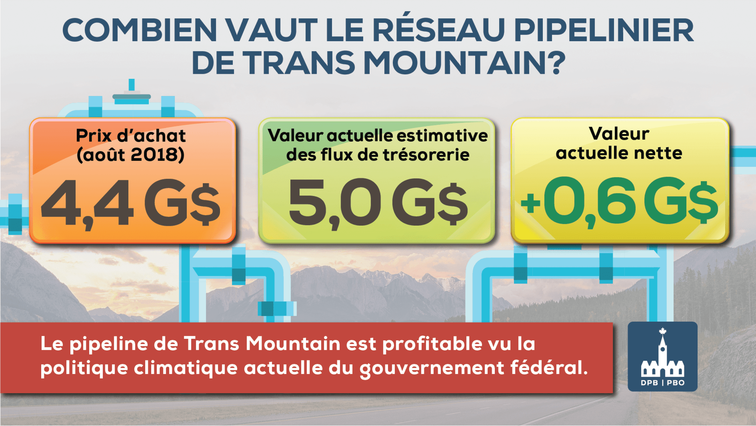 La décision prise par le gouvernement du Canada d’acquérir, d’agrandir, d’exploiter puis d’un jour céder les actifs du réseau de pipelines Trans Mountain demeure profitable. Toutefois, la profitabilité des actifs dépend fortement de la position du gouvernement fédéral à l’égard du climat et du taux d’utilisation de la capacité du pipeline.