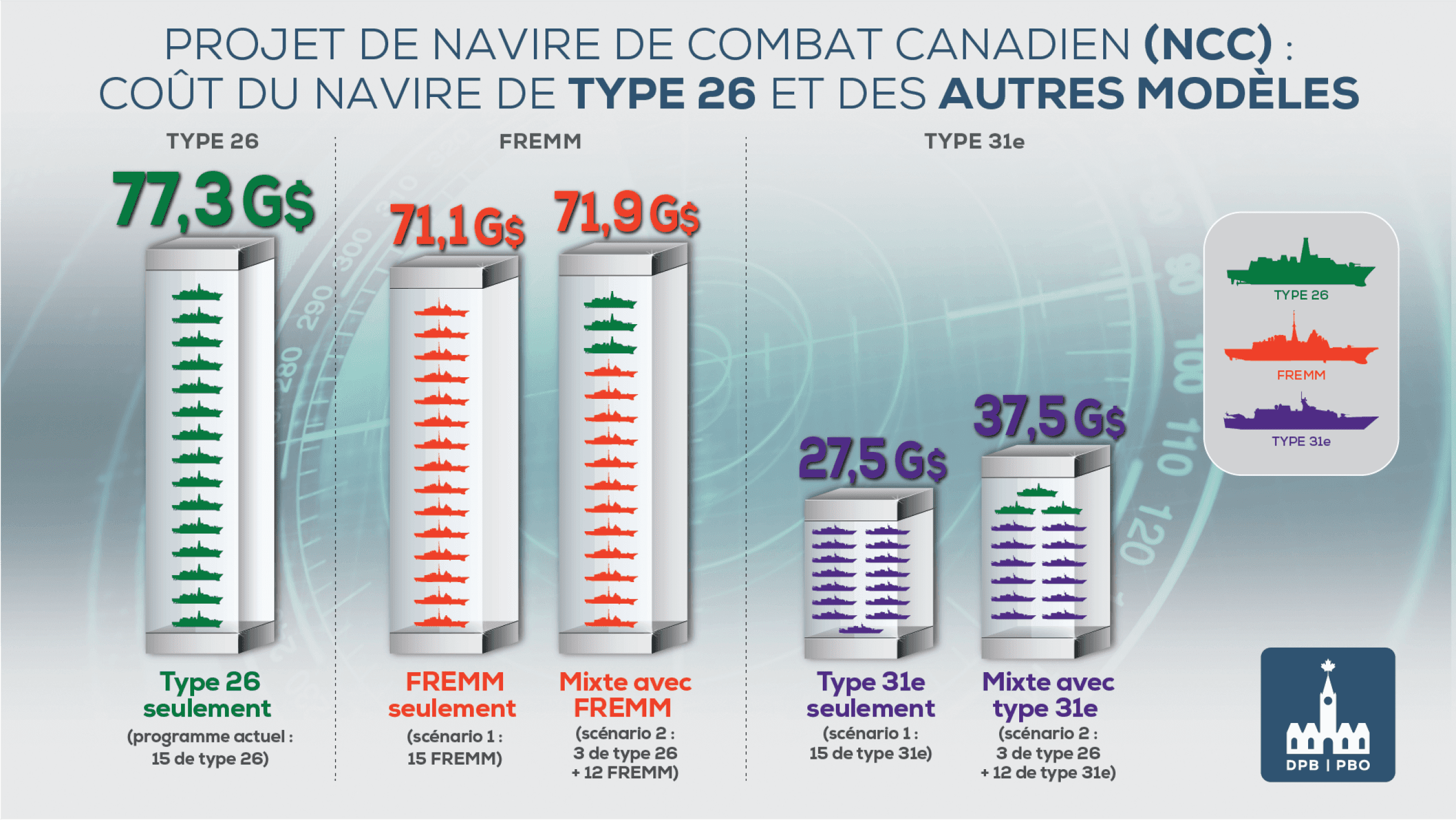 En réponse à une demande du Comité permanent des opérations gouvernementales et des prévisions budgétaires de la Chambre des communes (le Comité OGGO), le présent rapport présente une analyse des coûts de la poursuite de la construction de navires de combat canadiens (NCC) de type 26, ainsi que du coût de deux autres modèles : la frégate européenne multi-mission (FREMM) et le navire de type 31e.