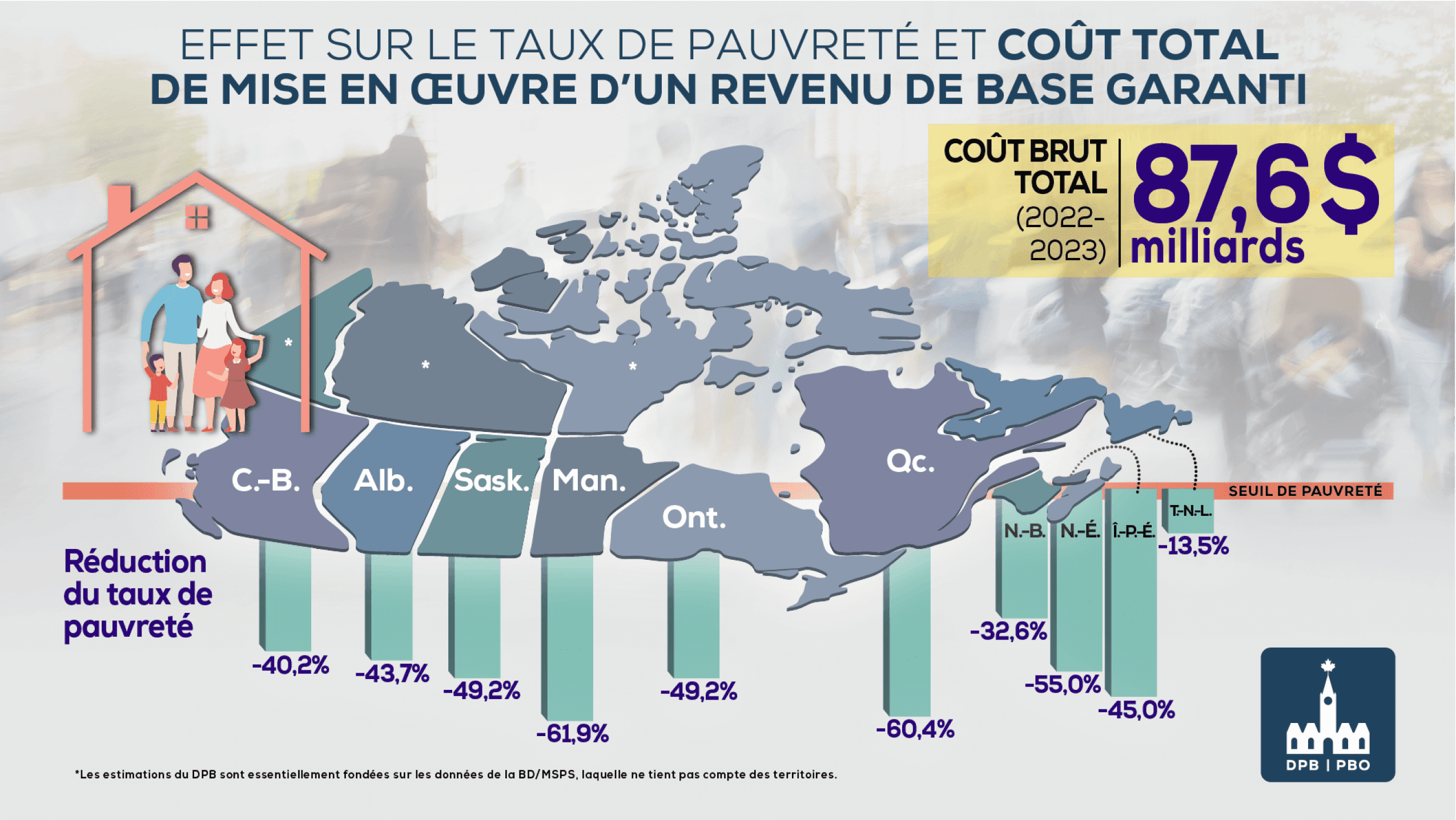 En juillet 2020, le directeur parlementaire du budget (DPB) a publié une estimation des coûts bruts du revenu de base garanti (RBG) et des compensations fiscales pouvant être générées par l’annulation des programmes fédéraux et provinciaux existants destinés aux particuliers et aux familles à faible revenu[^6].