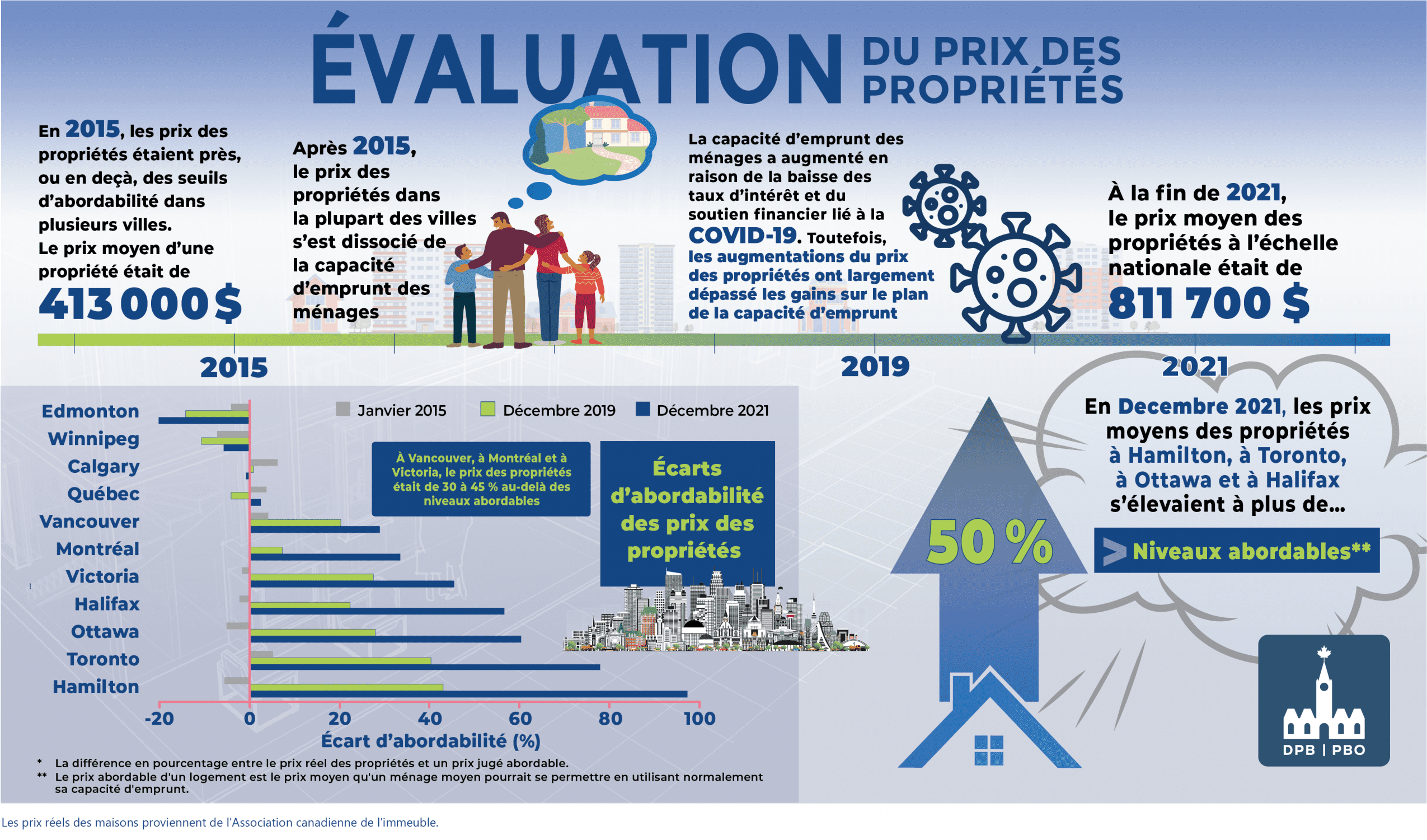À la fin de 2021, le prix moyen des propriétés à l’échelle nationale était de 811 700 $ – soit 43 % de plus qu’en décembre 2019 et 97 % de plus qu’en janvier 2015. Nous estimons qu’en décembre 2021, le prix moyen des propriétés à Hamilton, Toronto, Halifax et Ottawa était supérieur de plus de 50 % aux niveaux abordables pour les ménages à revenus moyens.
