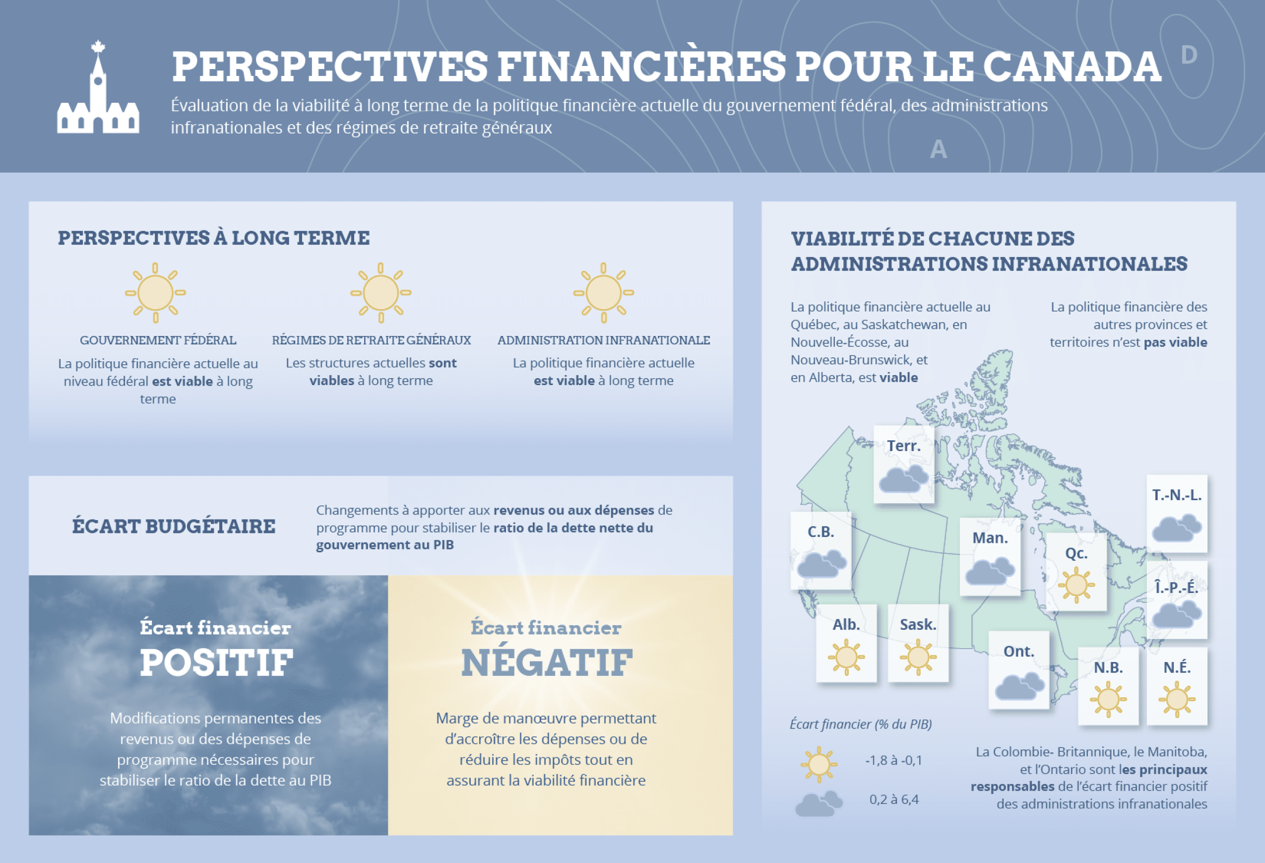 Dans ce rapport, le DPB présente son évaluation de la viabilité financière à long terme du gouvernement fédéral, des administrations infranationales et des régimes de retraite généraux.