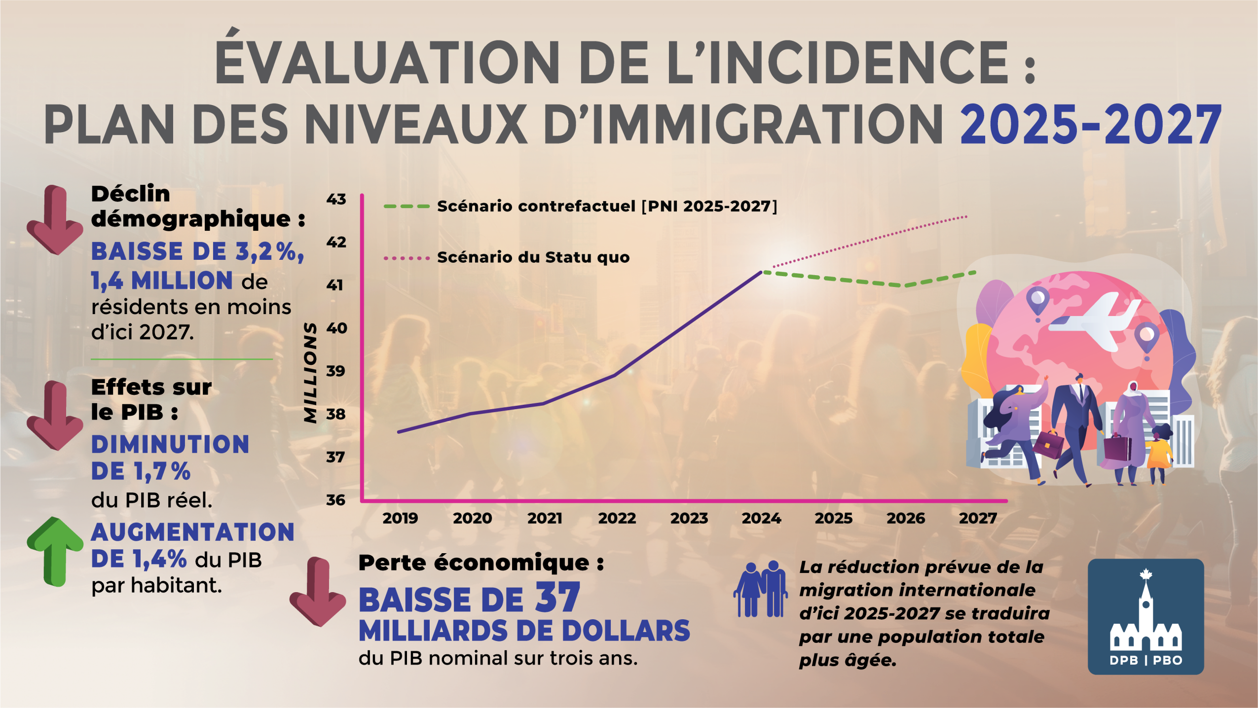 Ces nouvelles cibles de migration internationale représentent une révision à la baisse de 3,2 % des projections démographiques du Canada, révision qui se traduira par 1,4 million de résidents de moins à la fin de 2027.